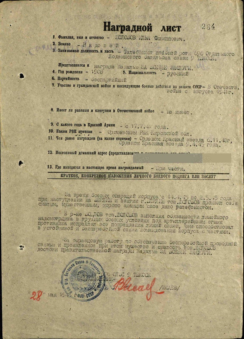 | Награждён: Медаль «За боевые заслуги» | 27.06.1945 | Приказ № 147/н по 9 тк | |
