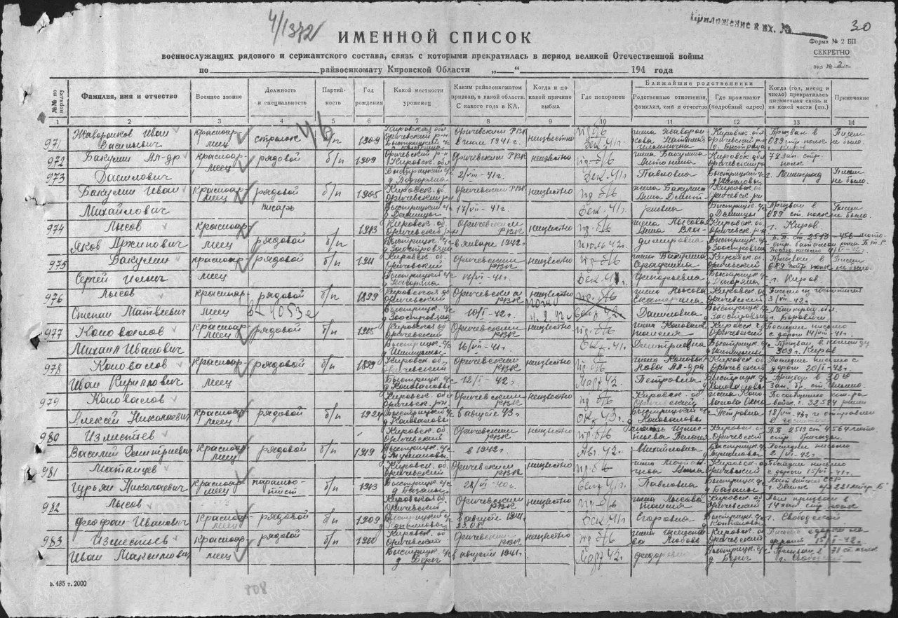 | 4308323003 | ЖАВОРОНКОВ Иван Васильевич | 1909 г. р., с. Быстрица Быстрицкого с/с, красноармеец, стрелок, 689 сп, г. Киров, в декабре 1941 г. пропал без вести. | Кировская область, Оричевский район | |||