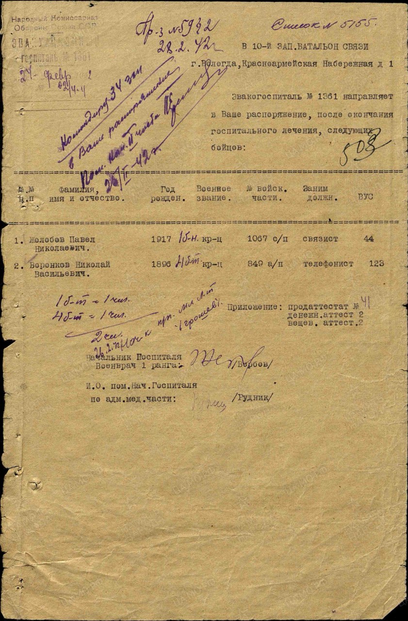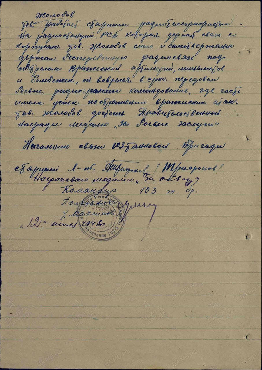 Жолобов Павел Николаевич, 1917 г.р., из д. Жолобовы Пустошенского с/с Оричевского района Кировской области. Член ВЛКСМ. Мобилизован Орическим РВК 18.07.1941 г. в 689 сп. Фактически: красноармеец, связист (ВУС-44), 1067 сп 311 сд. Есть в списке 1067 сп. Ранен. ЭГ 1361. 34 зсп 26.02.1942 г. Ст. сержант, старший радист, рота управления, 103 тбр. Умер от ран 22.08.1944 г. Первичное место захоронения: Белорусская ССР, Брестская обл., г. Брест, крепость, Польское военное кладбище, могила № 3. Награды: Медали «За отвагу», «За оборону Ленинграда».
