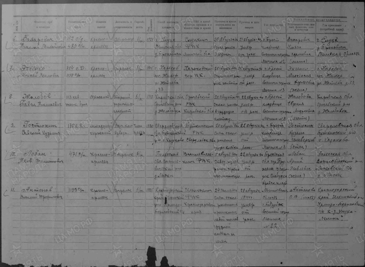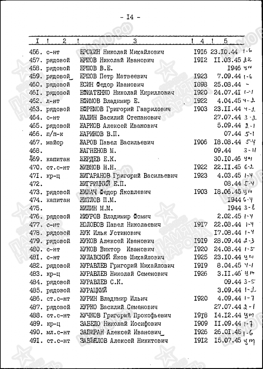 | 4308327017 | ЖОЛОБОВ Павел Николаевич | 1917 г. р., д. Жолобовы Пустошенского с/с, сержант, ст. радиотелеграфист, в-ч 103 сев. танк, бригада, 22.08.1944 г. умер от ран в 198 мэп. Захоронен в г. Брест, кладбище воен. городка, могила № 3. | Кировская область, Оричевский район |