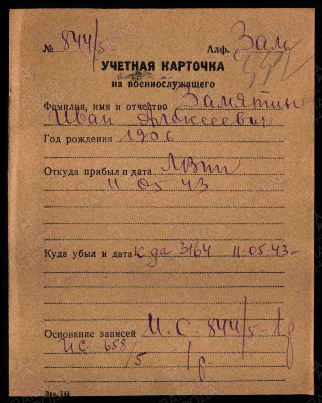 Замятин Иван Алексеевич, 1906 г.р., из д. Озерные Трапицынского с/с Оричевского района Кировской области. Мобилизован Орическим РВК 18.07.1941 г. в 689 сп. Фактически: младший командир, командир отделения, 1067 сп 311 сд (принял присягу 24.07.1941 г. в г. Кирове). Попал в другую часть. 68 сп 70 сд. Ранен. Выбыл 07.11.1941 г. из ЭГ 1170 в госпиталь 2011. Ранен. Выбыл 24.09.1942 г.из СЭГ 1170 в госпиталь 2014. Из ЭГ 925 выбыл в часть 19.01.1943 г. Из ЭГ 1359 выбыл в Ленинградский ВПП 11.05.1943 г. Прибыл в ПРБ 36 зсбр с командой 5/935 сп. 48, убыл с командой 3164. Награды: Орден Отечественной войны I степени (1985 г.).
