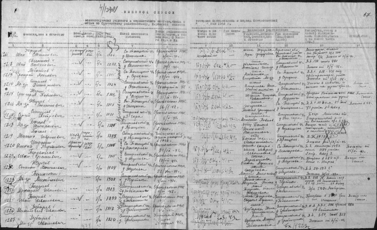 | 4319066005 | ЗУБАРЕВ Анатолий Иванович | 1917 г.р.. Смирновский с/с, д. Гребенщики. Пропал без вести в январе 1942 года. [Боец 689 сп 411 сд] | Кировская область, Оричевский район |