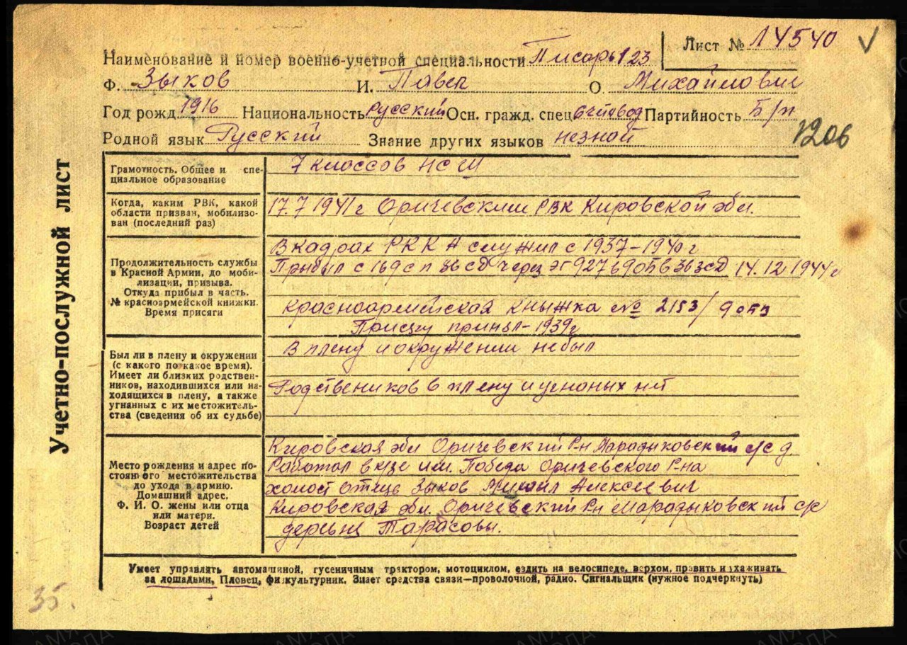 Зыков Павел Михайлович, 1916 г.р., из д. Тарасовы Марадыковского с/с Оричевского района Кировской области. Член ВЛКСМ. Мобилизован Орическим РВК 18.07.1941 г. в 689 сп. Фактически: младший командир (ВУС-21), ст. сержант, 311 сд (предполагается). Легко ранен. Из ЭГ 1170 выбыл 08.09.1941 в больницу им. Софьи Петровской (19 сп). 78 зсп (06.08.1942) выбыл в 1 сд ВВ НКВД, 59 сп 85 сд, 91 опабр 16 УР, 36 зсп (10.02.1944 г.), стрелок, отдельный лыжный батальон 85 сд (на 19.03.1944 г.), 223 азсп выбыл 18.08.1944 г. в 86 сд. Тяжело ранен 25.08.1944 г. Из СЭГ 1170 выбыл 07.09.1944 г. в госпиталь 991. Из ЭГ 991 выбыл 07.12.1944 г. в ЭГ 927. 267 зсп (14.12.1944 г.), 221 азсп, 169 сп 86 сд, стрелок, комендантский взвод штаба дивизии 56 сд (с 17.01.1945 г.). Медали «За отвагу» (две), «За оборону Ленинграда», орден Отечественной войны I степени (1986).