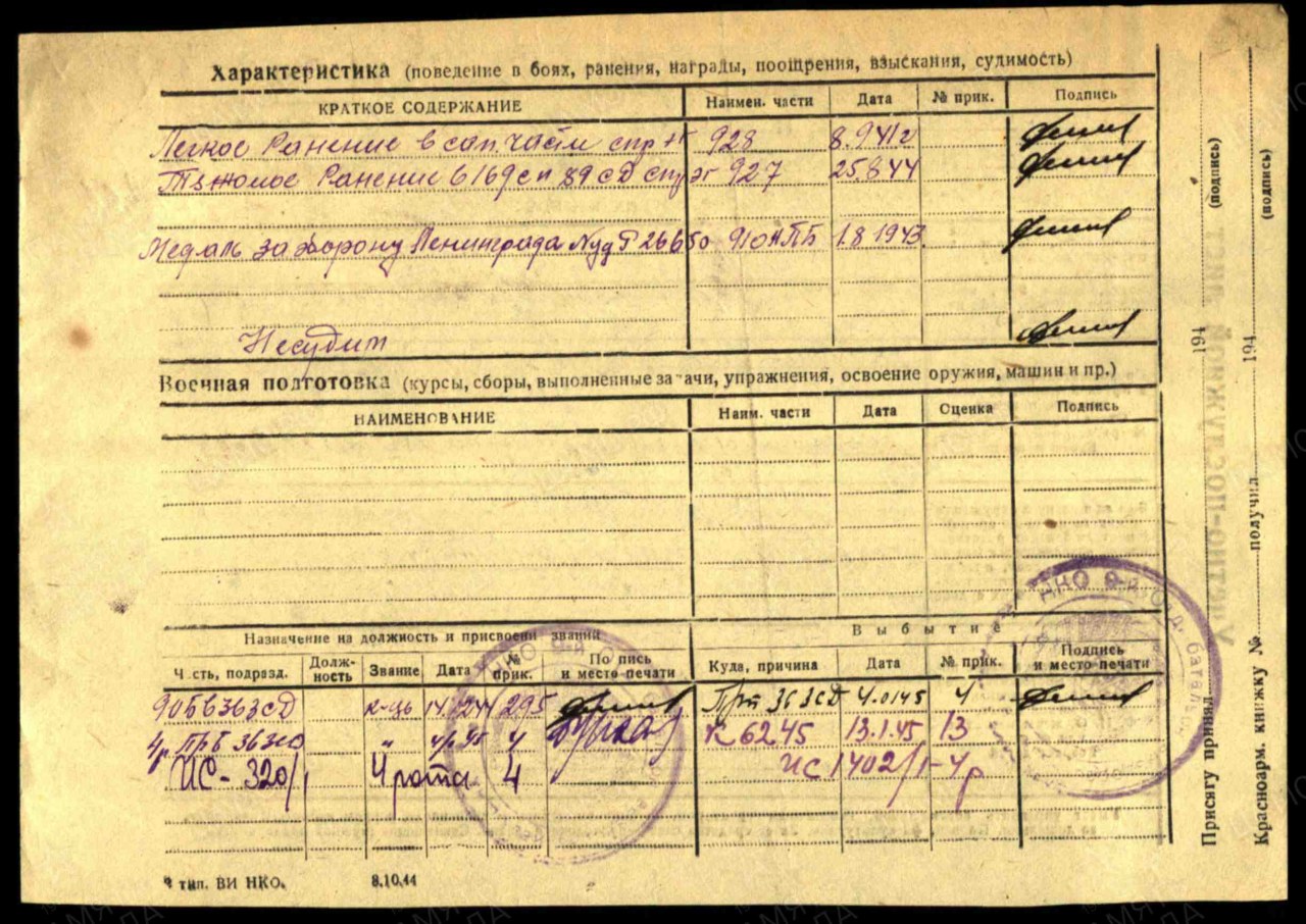 | Награждён: медаль "За оборону Ленинграда" | 01.08.1943 | 91 опаб | |