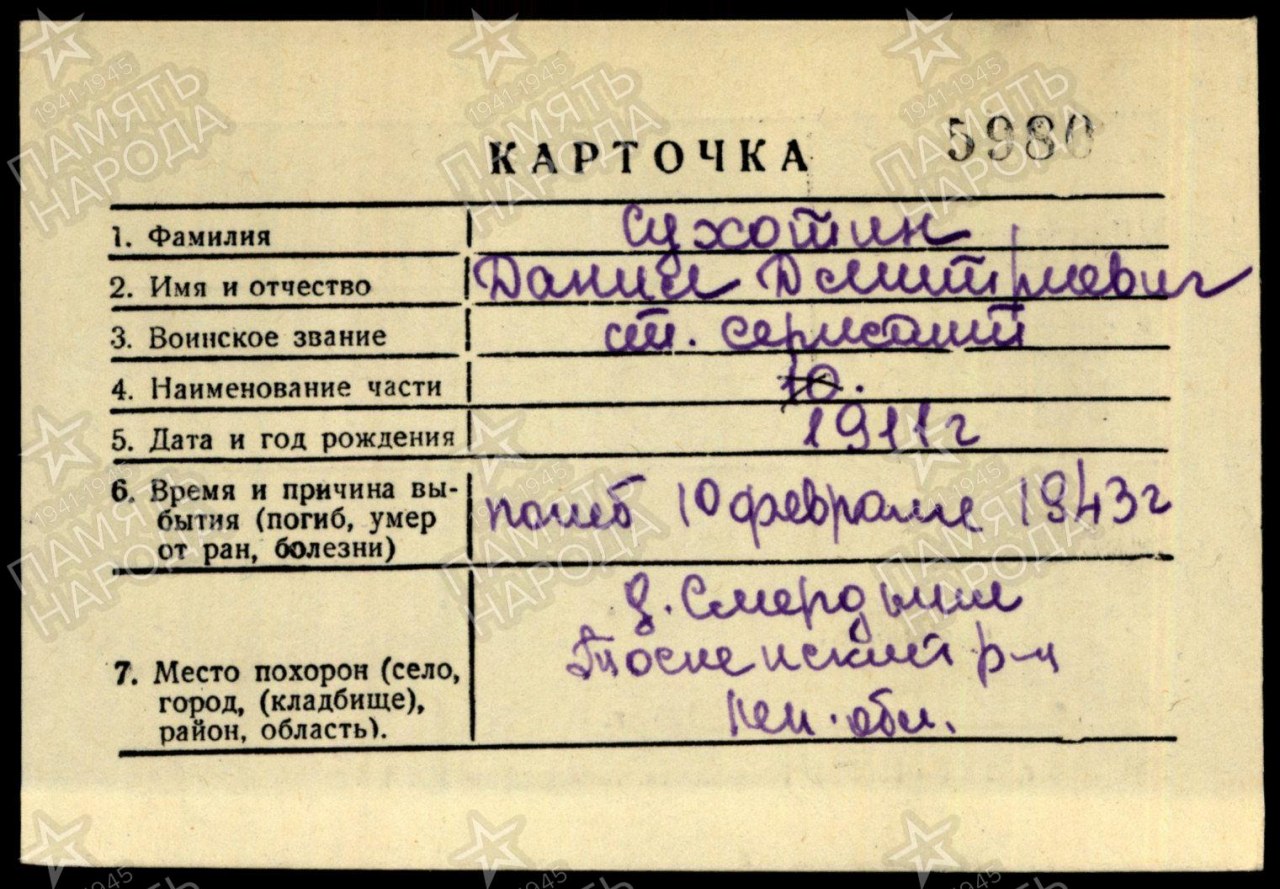 | 4302509027 | СУХОТИН Данил Дмитриевич | 1911 г. р., из д. Фадинцы Желтопесковского с/с, ст. сержант, погиб в бою 10.02.1943 г. Захоронен в Ленинградской обл., Тосненский р-н, д. Смердент. | Кировская область, Верхошижемский район |