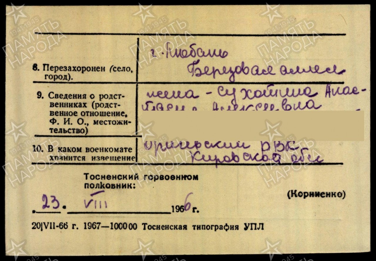 | призван Верхошижемский РВК, Кировская область, Верхошижемский райо-н | 18.07.1941 | пгт Верхошижемье (Верхошижемский район, Кировская область) - существующий н.п. | |