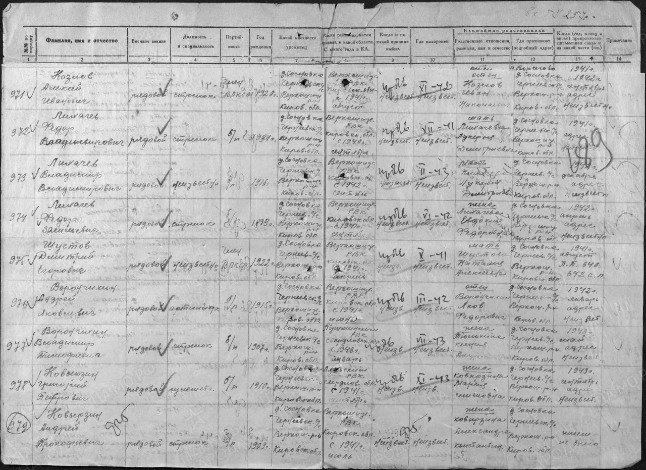 | 4302429020 | КОВЫРЗИН Андрей Прокопьевич | 1909 г. р., из д. Сосновка Чернеевского с/с, красноармеец, стрелок, пропал без вести в декабре 1941 г. | Кировская область, Верхошижемский район |