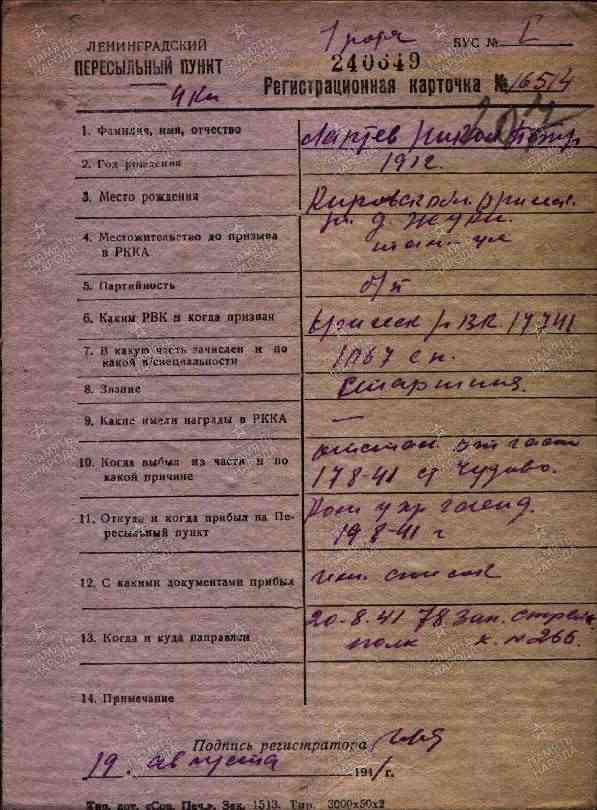 Лаптев Николай Петрович, 1912 г.р., из д. Жуки Марадыковского с/с Оричевского района Кировской области. Мобилизован Орическим РВК 18.07.1941 г. в 689 сп. Фактически: младший командир, старшина, 1067 сп 311 сд (принял присягу 24.07.1941 г. в г. Кирове). Отстал от 1067 сп 17.08.1941 на ст. Чудово Ленинградский ВПП (18-20.08.1941) выбыл в 78 зсп. Последнее письмо 12.09.1941 г. пп 955, 311 сд. Считается пропавшим без вести в декабре 1941 г.