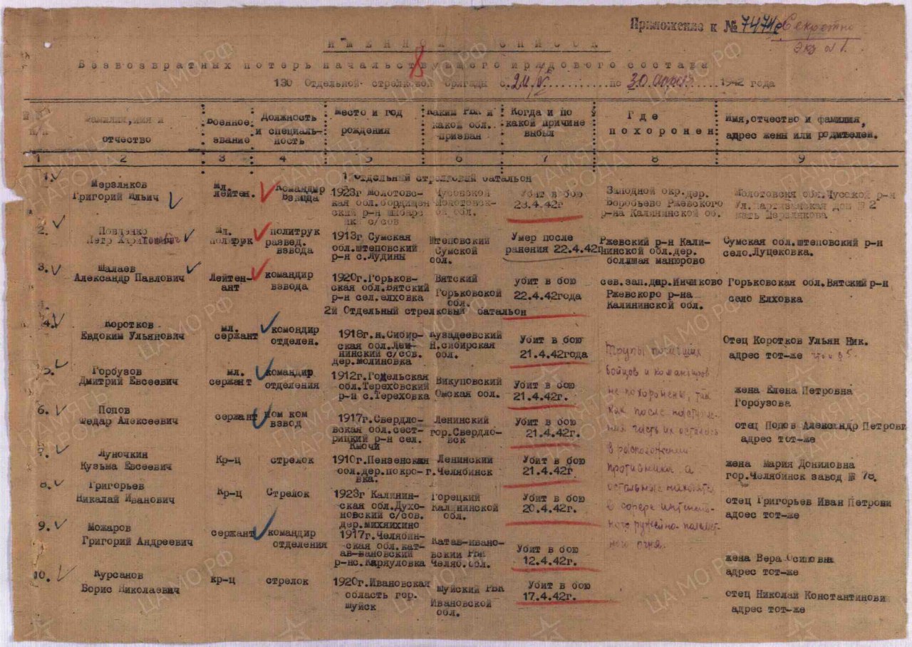 | Погиб | 21.04.1942 | Калининская обл., Ржевский р-н |
