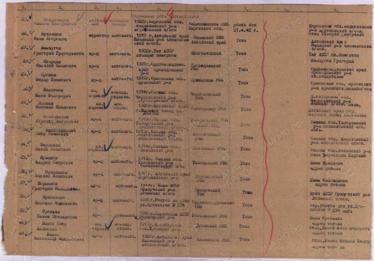 | 4314171008 | ПОЛОВНИКОВ Михаил Тимофеевич | 1922 г. р., из дер. Четвертная Монастырского с/с, лейтенант, командир взвода отдельной роты автоматчиков 130 осбр, 21.04.1942 г. погиб в бою. | Кировская область, Юрьянский район |