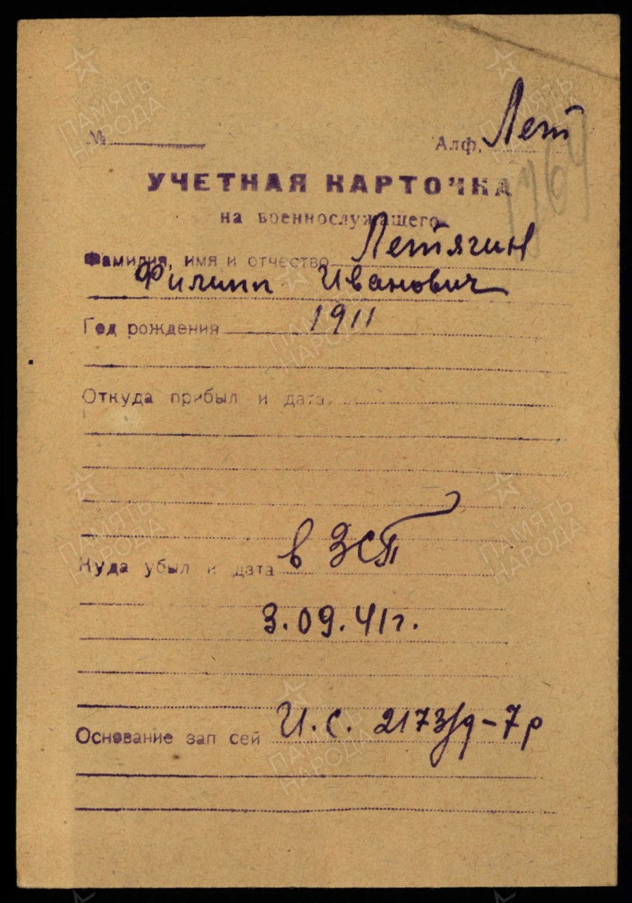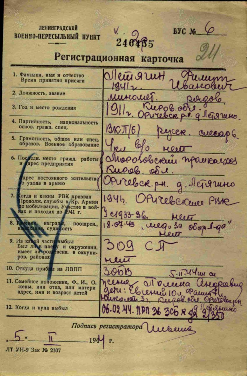 Летягин Филипп Иванович, 1911 г.р., из д. Летягины Чуркинского с/с Оричевского района Кировской области. Член ВКП (б) (на 02.1944 г.). Проходил срочную службу 1933 - 1936 г.г. Мобилизован Орическим РВК 18.07.1941 г. в 689 сп. Фактически: красноармеец, 311 сд (предполагается). ПРБ 36 зсп выбыл 03.09.1941 г. Из СЭГ 1170 выбыл 20.07.1943 г. в госпиталь 2012. Из ЭГ 2012 выбыл 23.11.1943 г. в ЭГ 264. Ленинградский ВПП ПРБ 36 зсп 06-07.02.1944 г. 389 зсп (06 - 11.02.1944 г.). Красноармеец, наводчик, минометчик, 309 сп 281 сд, 314 Кингисеппская сд. Красноармеец, стрелок, 314 сд. Погиб 02.03.1944 г. Первичное место захоронения: Эстонская ССР, Вируский уезд, Вайвара-Кирик, юго-западнее, 1 км, квадрат 82-47-В. Награды: медаль «За оборону Ленинграда».