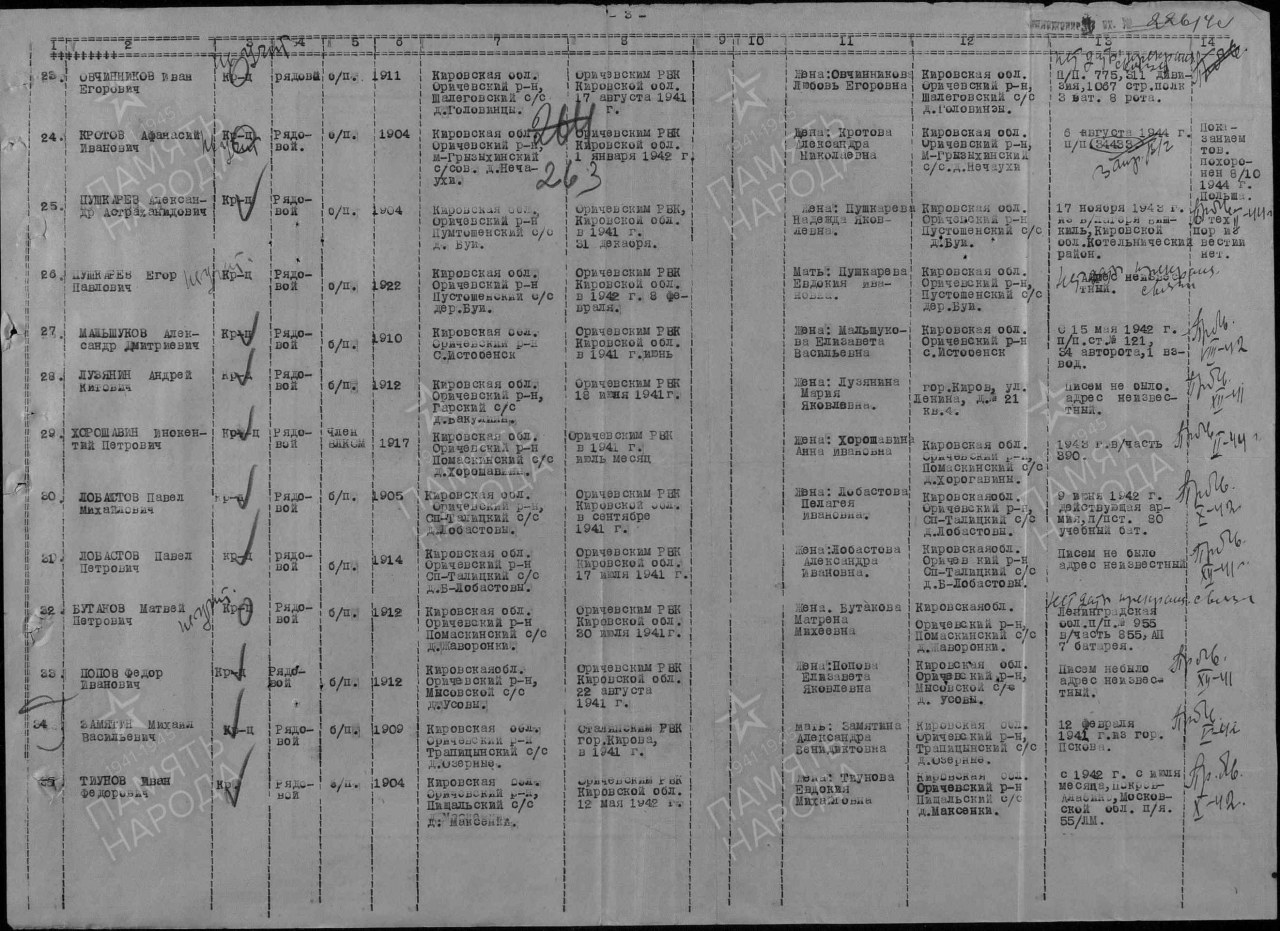 | 4308372011 | ЛОБАСТОВ Павел Петрович | 1914 г. р., д. Лобастовы Спас-Талицкого с/с, красноармеец, рядовой. В декабре 1941 года пропал без вести. | Кировская область, Оричевский район |