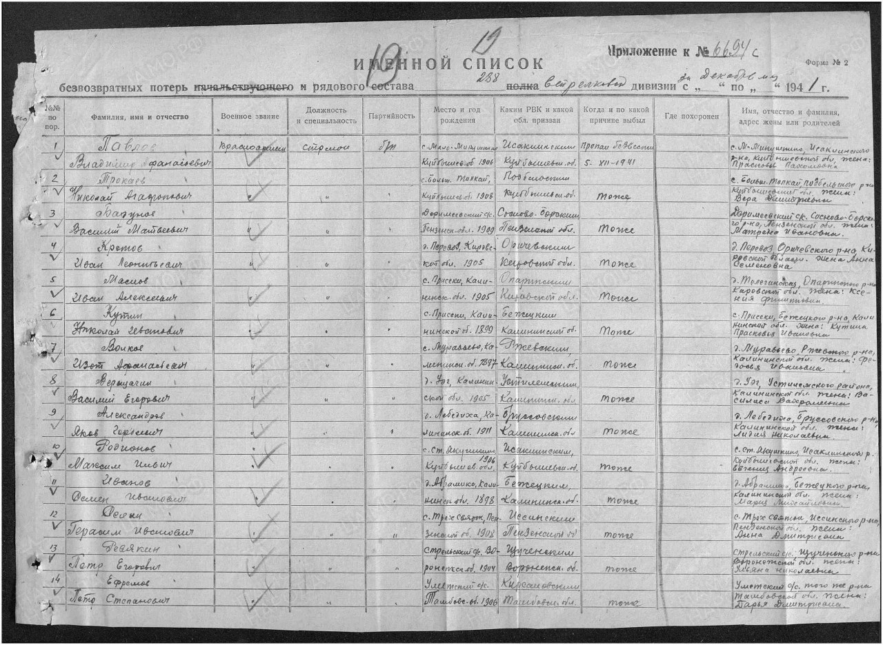 | 4308358022 | КРОТОВ Иван Леонтьевич | 1905 г. p., д. Перевоз Быстрицкого с/с, красноармеец, стрелок 41 зсп, 11 рота, 2 взвод, 858 ппс, 05.12.1941 г. пропал без вести. | Кировская область, Оричевский район |