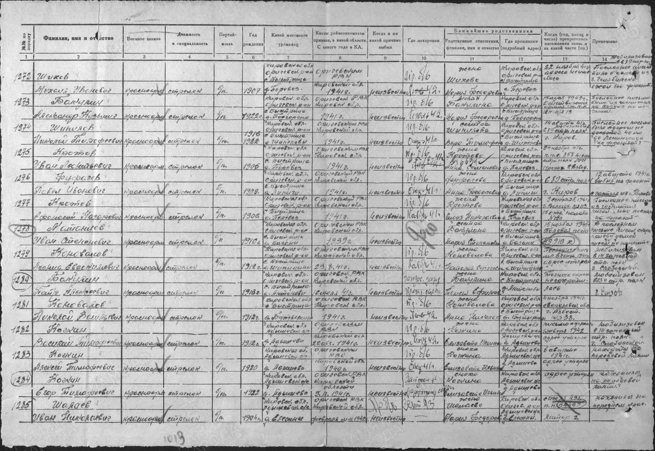 Кротов Иван Лентьевич, 1905 г.р., из д. Перевоз Быстрицкого с/с Оричевского района. Мобилизован Оричевским РВК 18.07.1941 г. в команду 903. Красноармеец, стрелок, 2-й батальон, 1067 сп 311 сд (принял присягу 24.07.1941 г. в г. Кирове). Попал в другую часть. 1014 сп, 288 сд (выбыл 22.10.1941 г. (пропал без вести из 1014 сп). Пропал без вести в Ленинградской области (из донесения 288 сд) 05.12.1941 г. Последнее письмо 24.11.1941 г. (ппс 858, 41 зап. стр. полк, 11 рота, 2 взвод). Считается пропавшим без вести 05.12.1941 г.