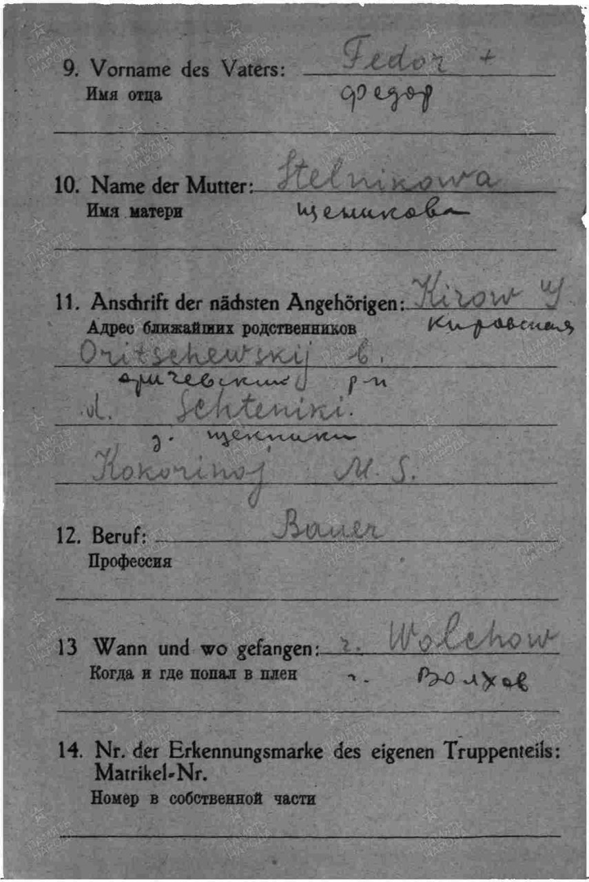 Кокорин Пётр Фёдорович, 1908 г.р., из д. Щенники Шабалинского с/с Оричевского района. Мобилизован Оричевским РВК 18.07.1941 г. в команду 903. Красноармеец, 1067 сп 311 сд (принял присягу 24.07.1941 г. в г. Кирове). Попал в другую часть. 68 сп 70 сд. Последнее письмо от 04.09.1941 г., адреса нет. Попал в плен под Волховом шталаг 326/шталаг VI K (326). Указан 68 сп. Умер 15.04.1942 г., захоронен в г. Дортмунд.