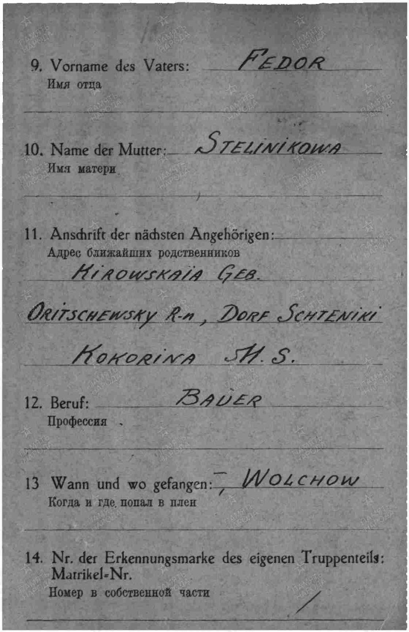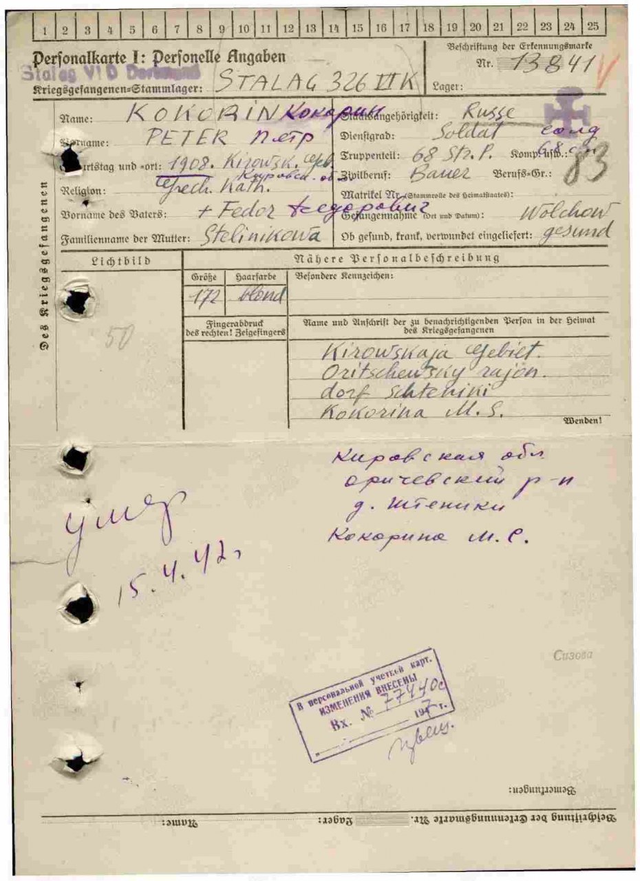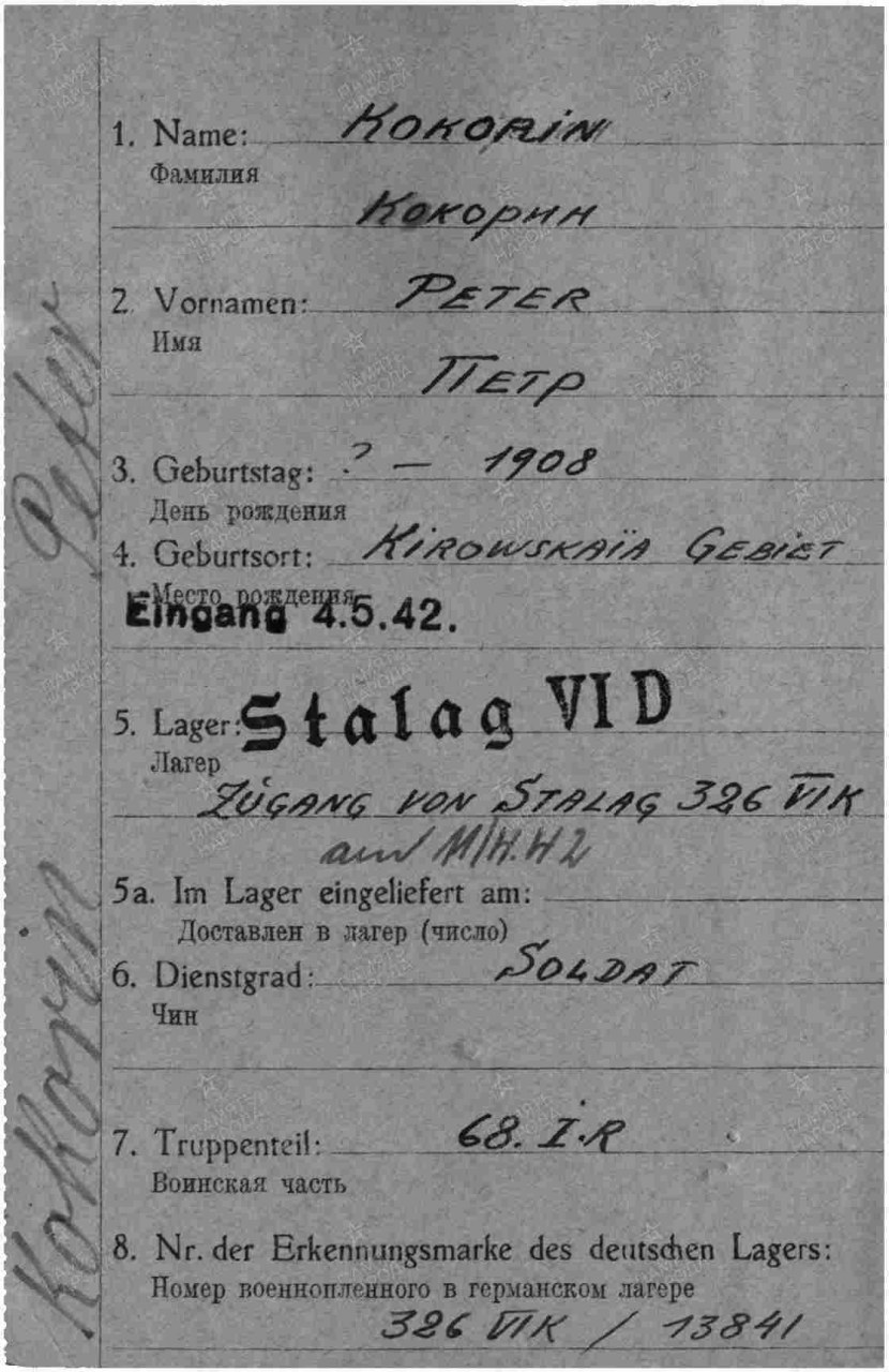 | 4319062006 | КОКОРИН Пётр Фёдорович | 1908 г.р., из д. Щенниковы Шабалинского с/с, призван Оричевским РВК 17.07.1941 г., красноармеец, рядовой 68 сп 70 сд. 02.12.1941 г. попал в плен в районе Волхова. Был отправлен в Германию в концлагерь «Шталаг VIK(326)», лагерный номер 13841. Умер 15.04.1942 г., захоронен в г. Дортмунд. Основание: трофейная и фильтрационная картотека, ф. Р3819. ЦАМО, ф. 58, оп. 977520, д. 906. | Кировская область, Оричевский район |