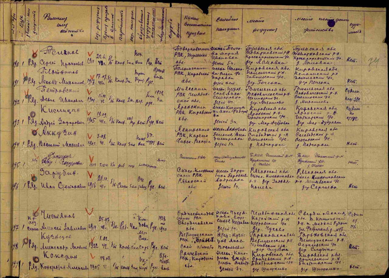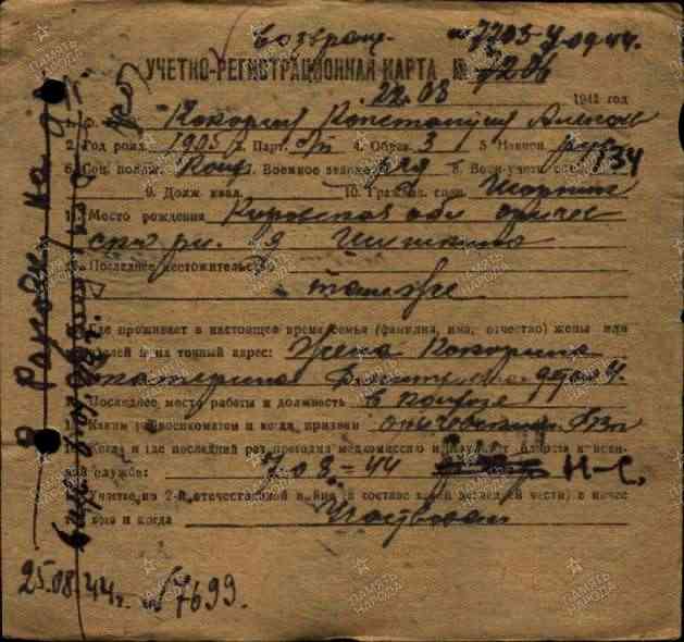 Кокорин Константин Алексеевич, 1905 г.р., из д. Шишкины Быстрицкого с/с Оричевского района. Мобилизован Оричевским РВК 18.07.1941 г. в команду 903. Фактически: красноармеец, 1067 сп 311 сд (принял присягу 24.07.1941 г. в г. Кирове). Попал в другую часть. 34 зсп выбыл 24.10.1941 с командой 4114. ВПП 36 зсп 18 зсбр Выбытие из воинской части: 30.03.1942 Куда выбыл: ВолхФ. Номер команды: 347. Комиссией ЭГ 3225 признан 29.02.1942 г. негодным к строевой службе (свидетельство о болезни № 134). Кировский ВПП 08.09.1944 в промышленность.