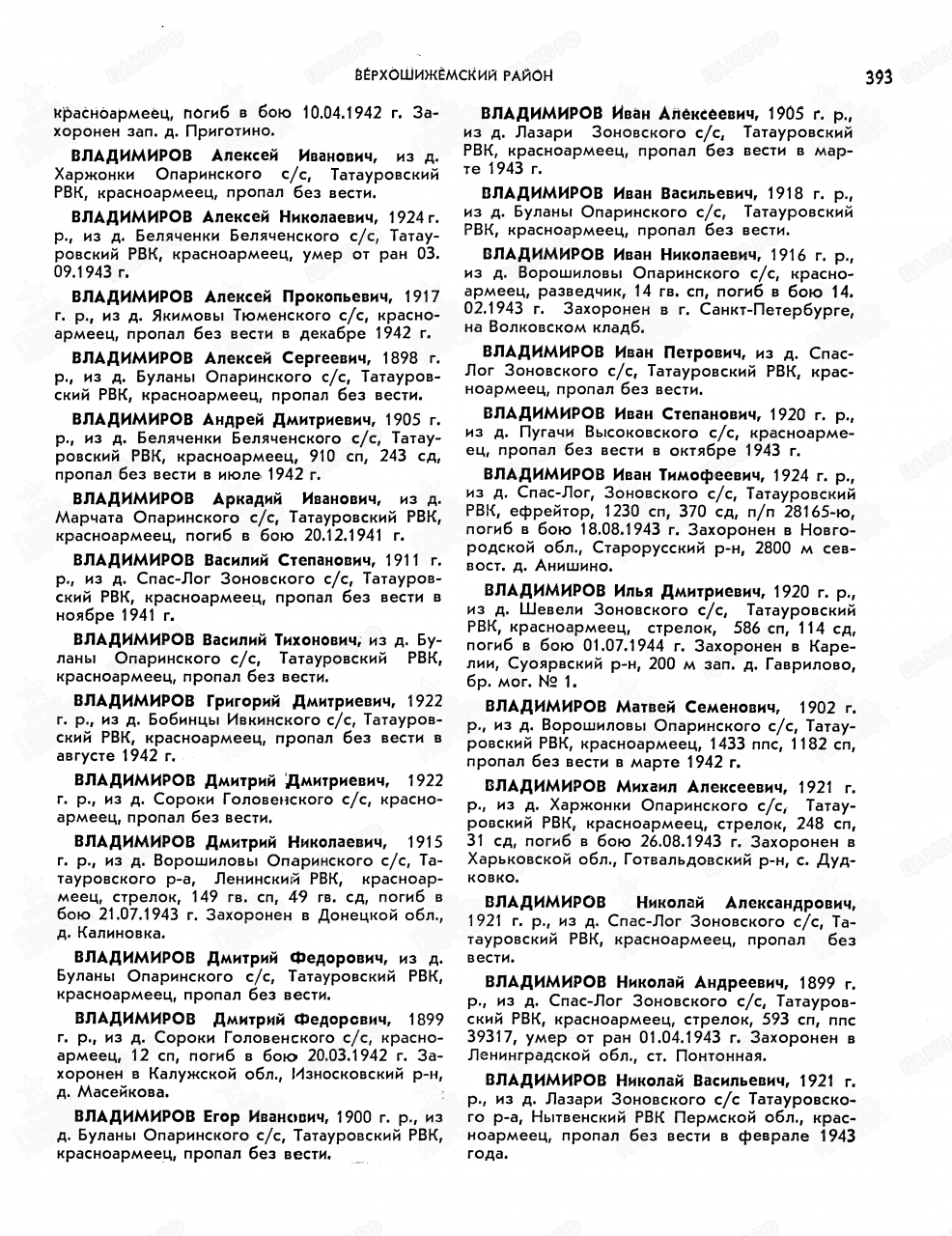 | 4302393003 | ВЛАДИМИРОВ Алексей Прокопьевич | 1917 г. р., из д. Якимовы Тюменского с/с, красноармеец, пропал без вести в декабре 1942 г. | Кировская область, Верхошижемский район |