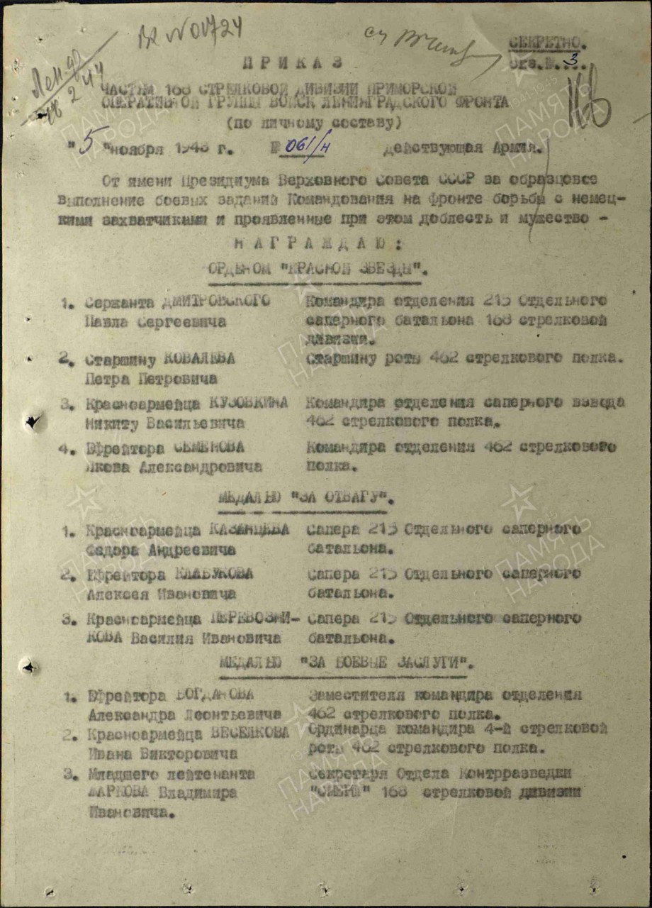 | участие в Великой Отечественной войне | 18.07.1941 - 09.05.1945 | Красноармеец, Ефрейтор, сапер 1067 стрелковый полк 311 стрелковой дивизии. В списке присяги лист 16 об № 37. источник ЦАМО. Фонд: 7737. Опись: 74237. Дело: 8 . Попал в другую часть 215 осапб, 168 сд. Ранен 23.02.1944 СЭГ 2222 | |