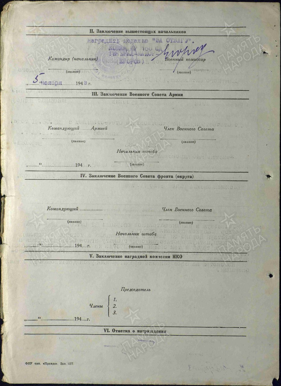 | Награждён: Медаль «За отвагу» | 05.11.1943 | Воинское звание: ефрейтор Воинская часть: 215 осапб Наименование награды: Медаль «За отвагу» Место призыва: Верхошижемский РВК, Кировская обл., Верхошижемский р-н Приказ подразделения №: 61/н от: 05.11.1943 Издан: 168 сд ПОГ Ленинградского фронта Информация об архиве - Архив: ЦАМО Фонд ист. информации: 33 Опись ист. информации: 686044 Дело ист. информации: 2069 Воинское звание: ефрейтор Военно-пересыльный пункт: 168 сд Кто наградил: 168 стрелковая дивизия Наименование награды: Медаль «За отвагу» Дата документа: 05.11.1943 Информация об архиве - Архив: ЦАМО Фонд ист. информации: Картотека награждений Дело ист. информации: шкаф 39, ящик 27 |