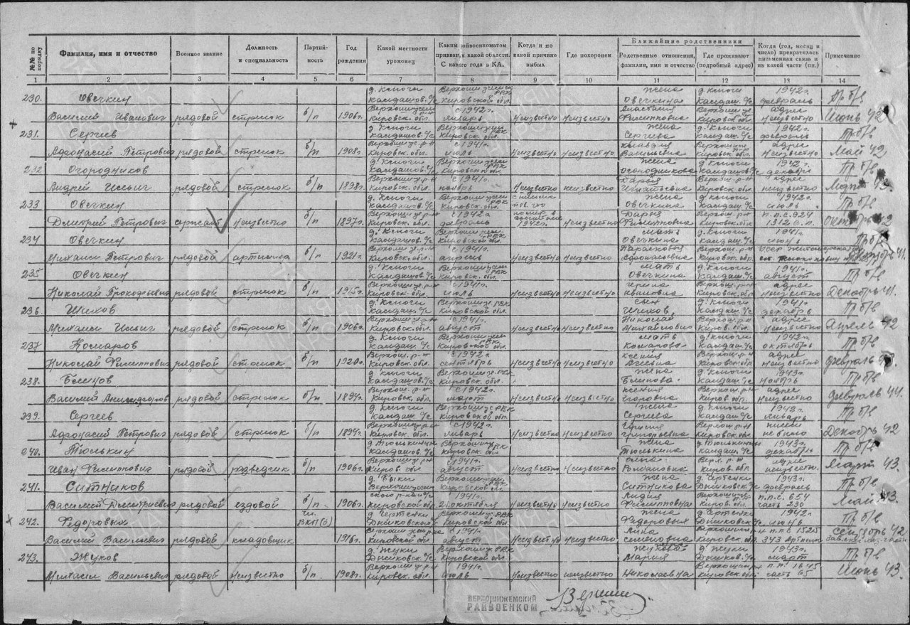 | 4302470025 | ОВЕЧКИН Николай Прокофьевич | 1916 г. р., из д. Ключи Калдашевского с/с, красноармеец, стрелок, пропал без вести в декабре 1941 года. | Кировская область, Верхошижемский район |