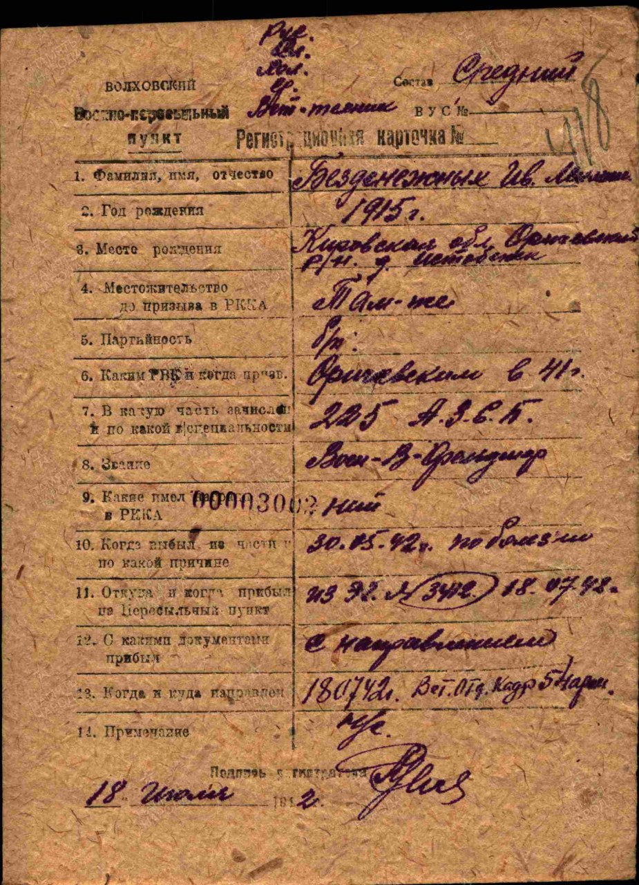 Безденежных Иван Михайлович, 1915 г.р., уроженец с. Истобенск Истобенской волости Орловского уезда. Мл. лейтенант ветеринарной службы, военветфельдшер, фельдшер ветеринарный, 1067 сп 311 сд (на должности с 16.07.1941 г., в списке приказа № 1 от 25.07.1941 г. по 1067 сп под № 142). В 1067 сп до марта 1942 г. 225 азсп. Выбыл 30.05.1942 г. по болезни. ЭГ 3412 (до 18.07.1942 г.). Волховским ВПП направлен в 54 А. Лейтенант ветеринарной службы, 177 сд. Награды: медаль «За победу над Германией в Великой Отечественной войне 1941–1945 гг.», орден Отечественной войны II степени (1985 г.). Дата окончания службы: 11.01.1945 г.