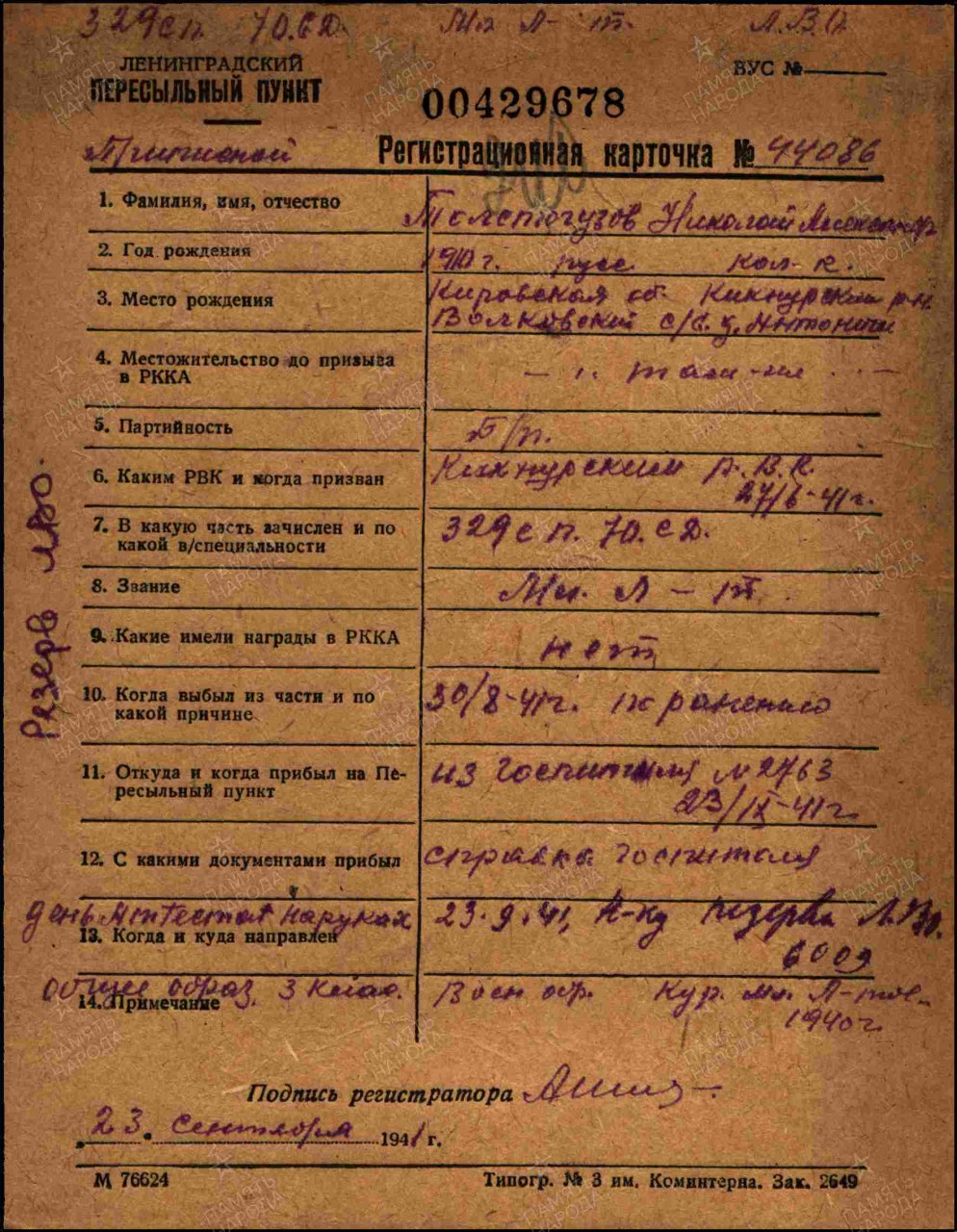 (Источники информации: ЦАМО. Фонд: 7737, Опись: 74507, Дело: 4; Фонд: Ленинградский ВПП. Опись: 530762. Дело: 43249; Фонд: 33. Опись: 11458. Дело: 633; Филиал ЦАМО (Архив военно-медицинских документов).Фонд: Картотека ранений Номер шкафа: Ленинградская картотека. 1941-1942 гг. Номер ящика: Ленинградская картотека. 1941-1942 гг-270-26)