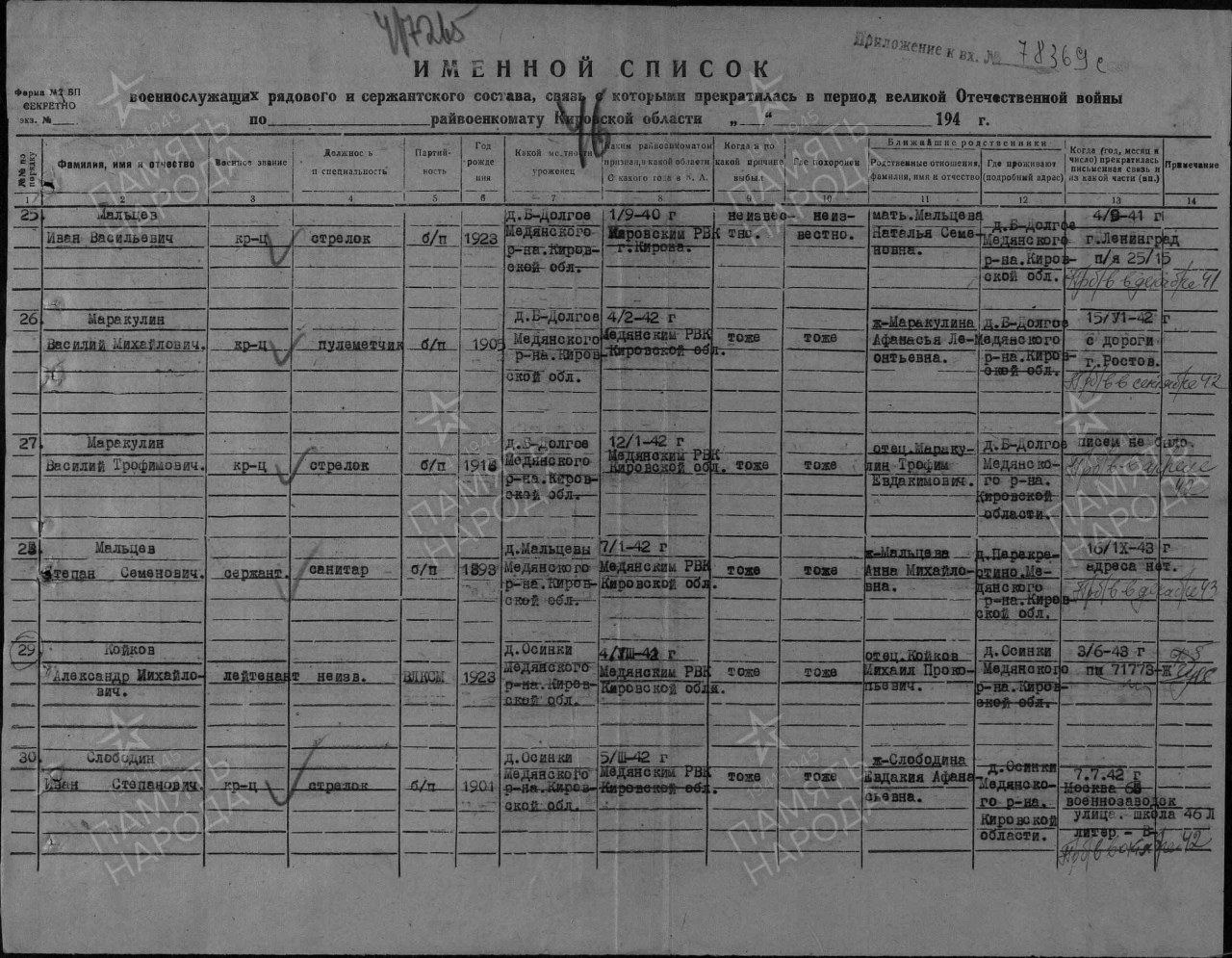 | 4308628025 | ПЕСТОВ Василий Пантелеевич | 1924 г. p., д. Зоновщина Цепелевского с/с, призван Медянским РВК Кировской обл., красноармеец, погиб 15.09.1943 г. Захоронен в Смоленской обл. | Кировская область, Орловский район | |||