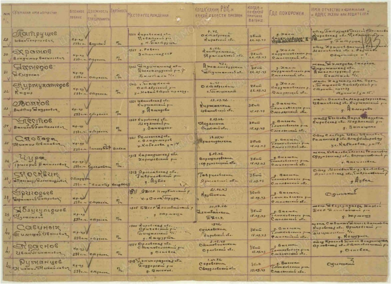 | 4314165004 | ПЕСТОВ Василий Пантелеевич | 1924 г. р., из дер. Замятино Загарского с/с, красноармеец, стрелок 597 сп, 207 сд, 15.09.1943 г. погиб в бою. Захоронен в Смоленской обл., Глинковский р-н, дер. Васюки. | Кировская область, Юрьянский район |