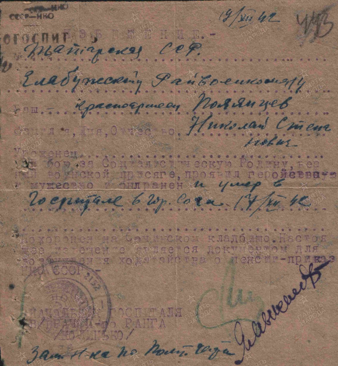 | 1609424016 | Полянцев Николай Степанович | моб. Елабужским РВК, кр-ц, умер от ран 17.12.1942, зах.: краснодарский край, г. Сочи. | Республика Татарстан, Елабужский район |