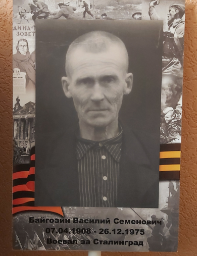 Родился в деревне Байгозята еще до революции. Мама -Байгозина Дарья Федоровна,Отец -Байгозин Семен Андреевич .Были сестры и братья -Лидия ,Александра и еще дочь ( впоследствии проживавшая в г.Кирс ) . В годы ВОВ воевал за Сталинград.Переехал в на Кубань станица Старонижестеблиевская Ставропольского края .Умер 26.12.1975 года там же.