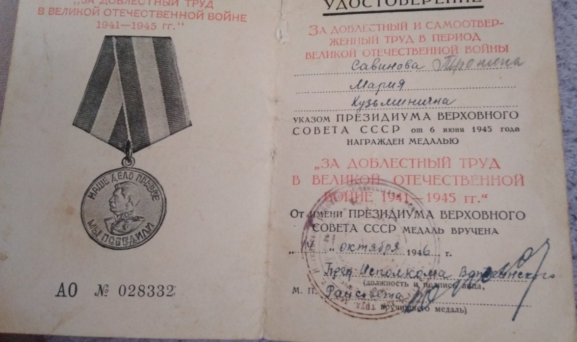 | 70765 | Савинова Мария Кузьминична 9 / 028332 | Р-н: Воткинский С/c: Июльский НП: Банное | Предприятие: Красное Знамя Должность: колхозница Стаж: с 1933г. | Даты: 26 ноября 1946г. / 4 июля 1946г. ЦГА УР: р-620,оп.4,д.950,л.26об,50об. |