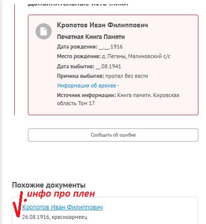 | 4317055004 | КРОПОТОВ Иван Филиппович | 1916 г. р., д. Пеганы, Малиновского с/с, сержант, пом. командира взвода, в/ч неизвестна. Пропал без вести в августе 1941 года. | Кировская область, Даровский район |