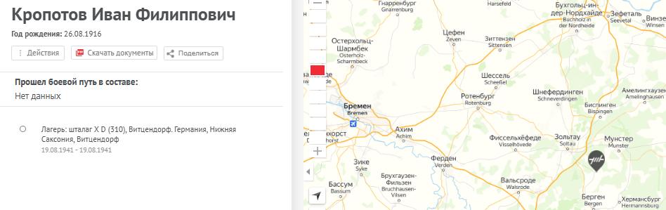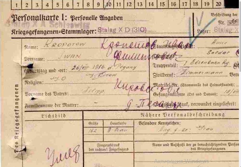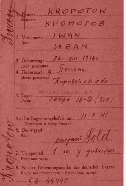 | Плен | 19.08.1941 - 10.06.1942 | Место пленения: ст.Чудово, Ленинградская обл. | 11.10.1941 отправлен в лагерь военнопленных: Германия, Витцендорф, шталаг XD (310). Лагерный номер 35440. |