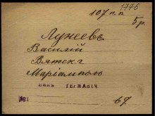 | Участие в 1 Мировой войне | - | Рядовой 107 пехотного Троицкого полка. 23.0.1915 г. – документ о том, что он пропал без вести д. Липщаны.( РГВИА Фонд №16196, Особое делопроизводство по сбору и регистрации сведений о выбывших за смертью или за ранами, а также пропавших без вести воинских чинах, действующих против неприятельских армий (1914 - 1918) Опись №1, Именные списки потерь солдат и офицеров 1 мировой войны 1914-1918 гг. (по полкам и бригадам) Дело №234, Списки потерь солдат 107 пехотного Троицкого полка Документ №72069, Именной список потерь нижних чинов 107 пехотного Троицкого полка с 22 января по 29 февраля 1915, Автор: 107-й пехотный Троицкий полк, 1915-03-29) Фактически попал в плен. Место пленения Мариамполе. Лагерь Ван у Кельна, Германия, Рейнская провинция (РГВИА Фонд Картотека бюро учета потерь в Первой мировой войне (офицеров и солдат)Шкаф без номера Ящик 3705-А) | |