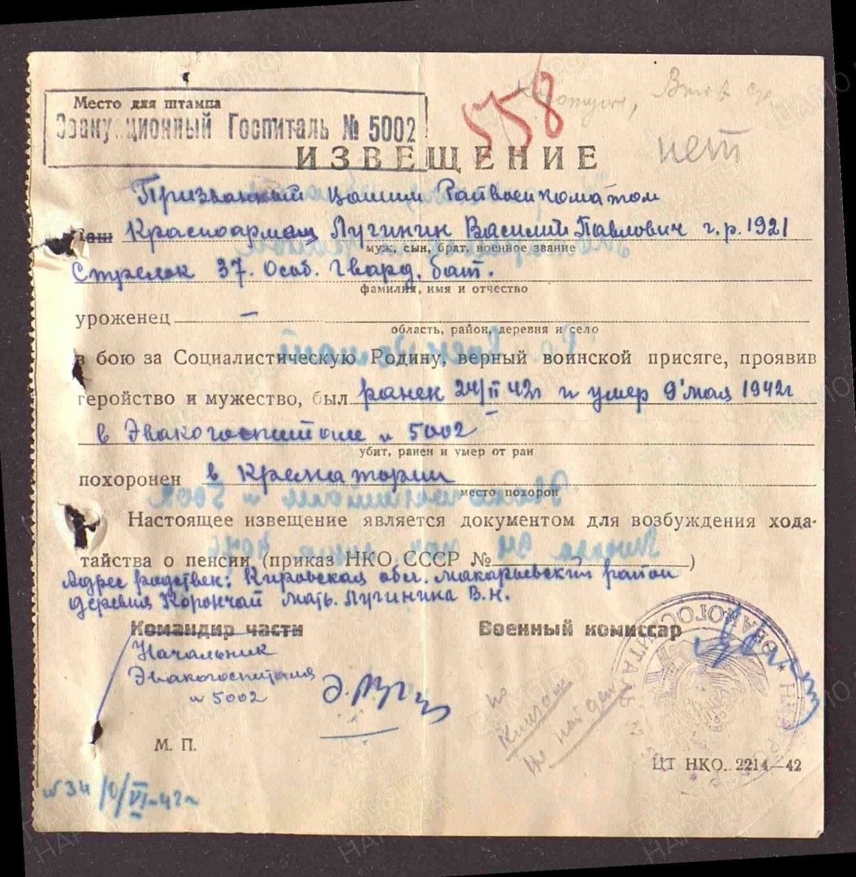 | 4305508021 | ЛУШНИН Василий Павлович | 1921 г. р., из д. Коробчата Зайцевского с/с, призван Макарьевским РВК, стрелок, 370 сп, умер от ран 09.05.1942 г., предан кремации, г. Москва. | Кировская область, Котельничский район |