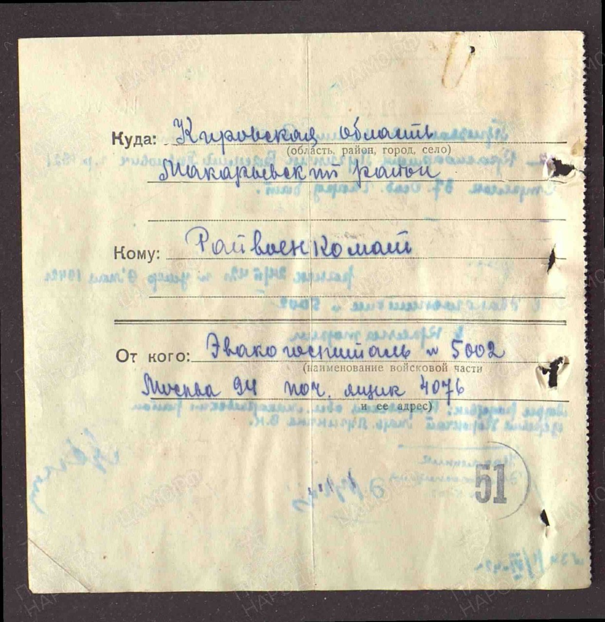 | Участие в Великой Отечественной войне | - | Призван Макарьевским РВК Кировской области 01.08.1941 г. Красноармеец, стрелок 370 сп. Ранен. | |