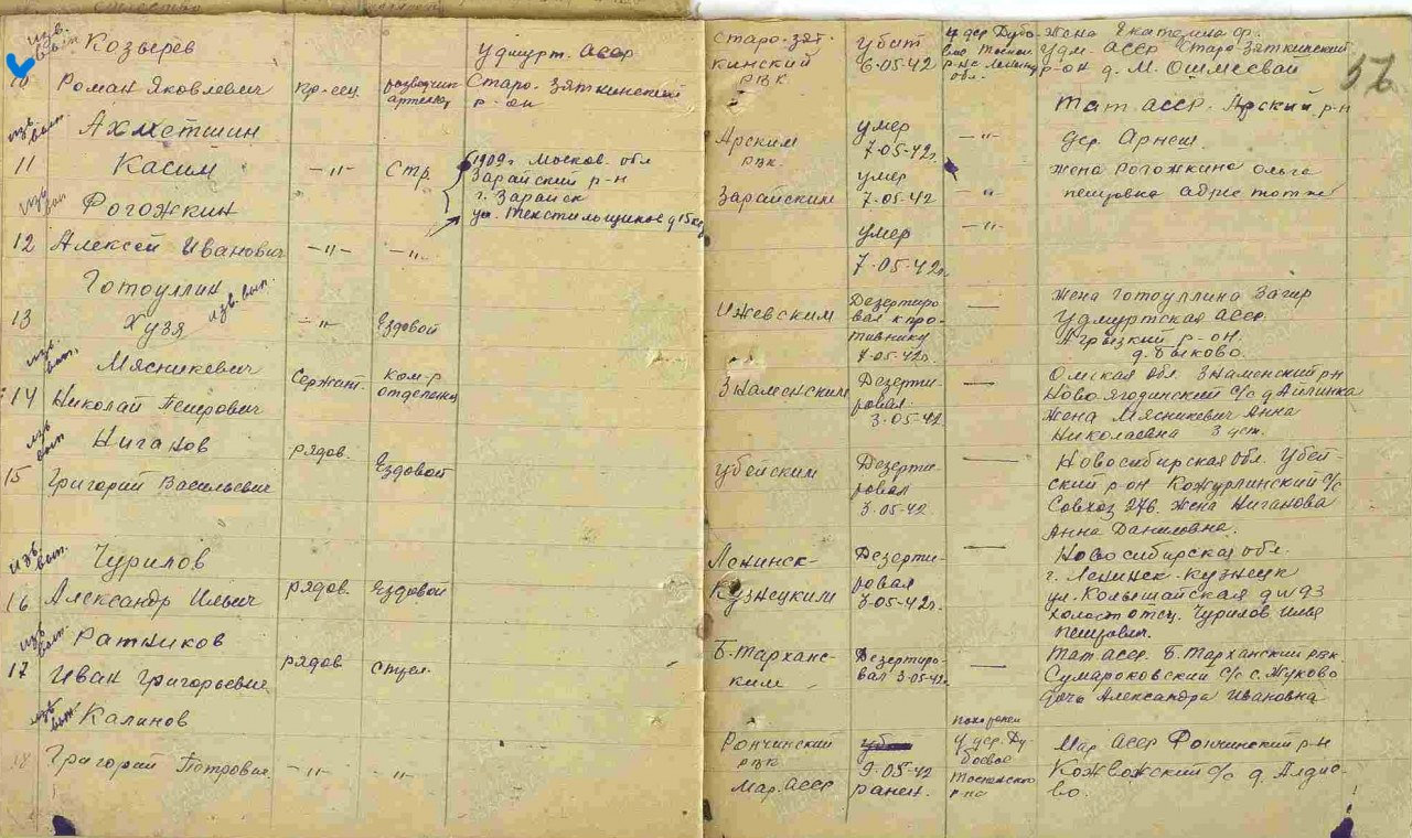 Комментарий: Козырев Роман Яковлевич родился 16 ноября 1907г. в деревне Малый Ошмесвай Увинского района Удмуртии. Погиб 6 мая 1942г. в Ленинградской области Тосненский район, деревня Дубовое. Метрическая книга: запись о рождении прилагается на страницу