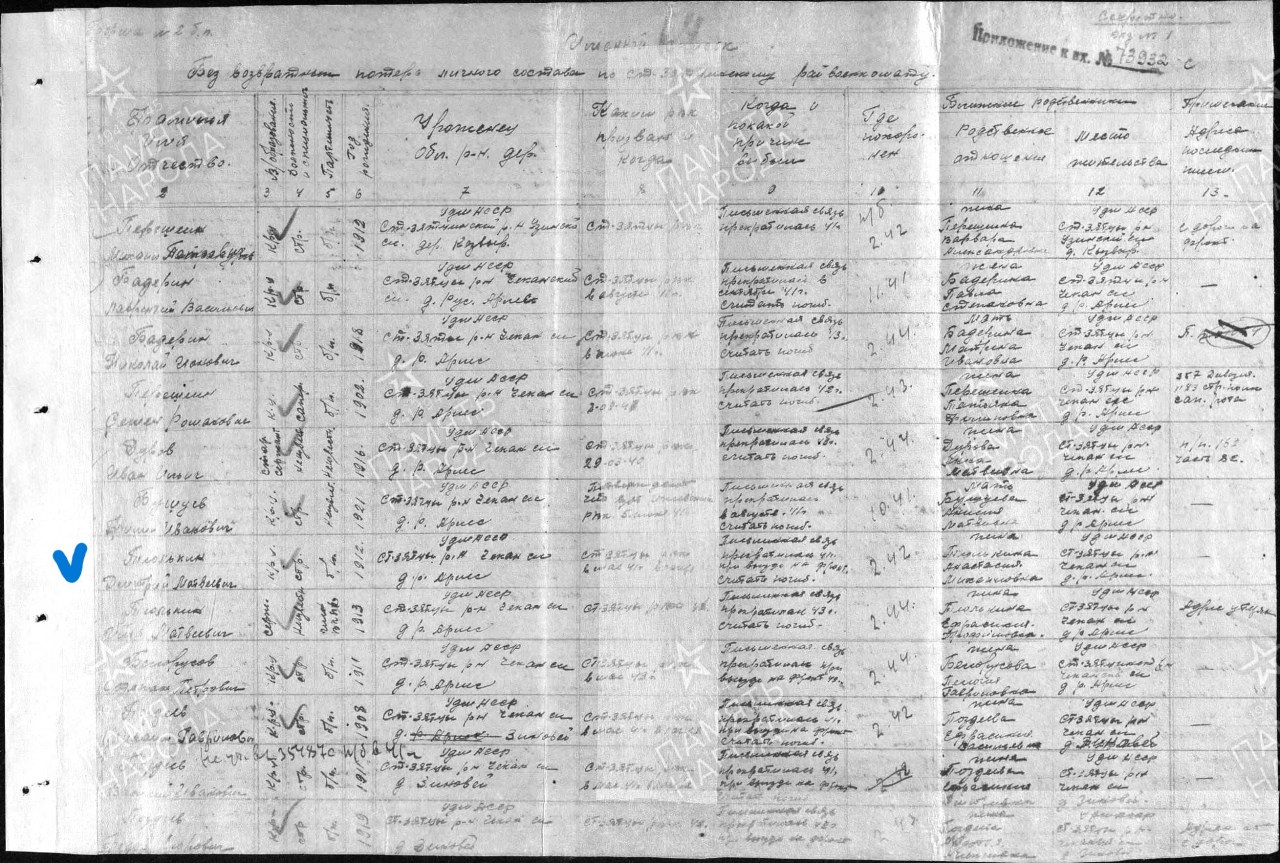 1802404039ТЮЛЬКИН Дмитрий Матвеевичрод. в 1912, д. Русский Арлез Старозятцинского р-на. Призван в Сов. Армию Старозятцинским РВК в 1941. Сержант. Пропал без вести в февр. 1942.Удмуртская Республика,