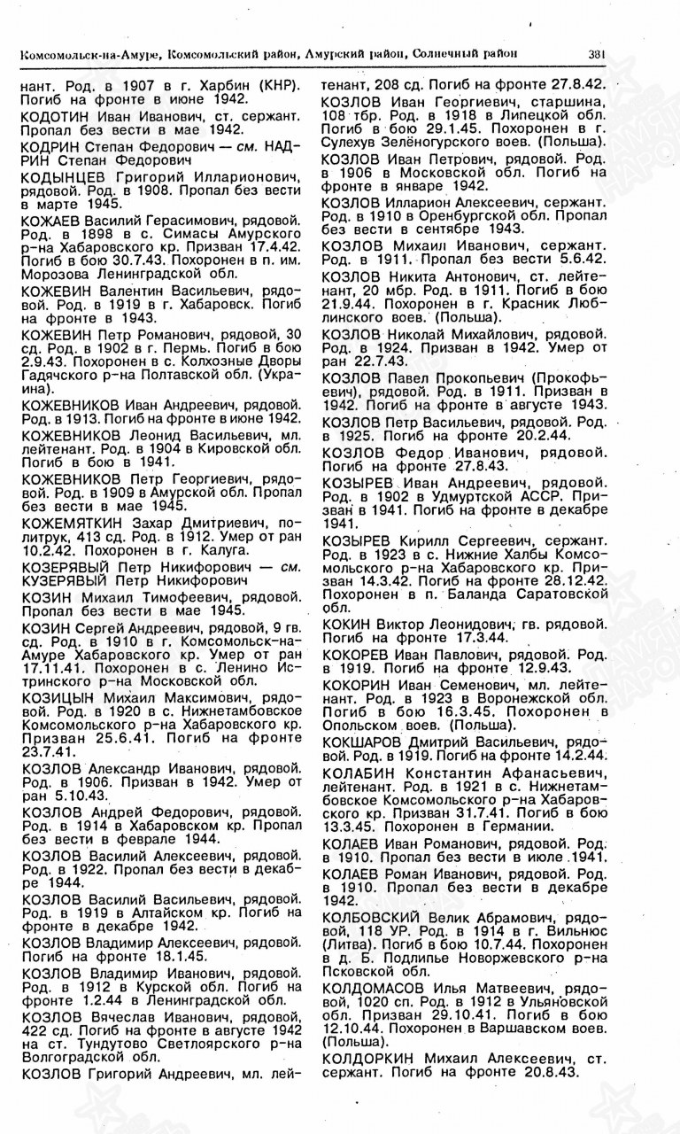 1802342012КОЗЫРЕВ Иван Андреевичрод. в 1902, с. Удугучин Старозятцинского р-на. Призван в Сов. Армию Старозятцинским РВК в 1941. Рядовой. Пропал без вести в дек. 1941.