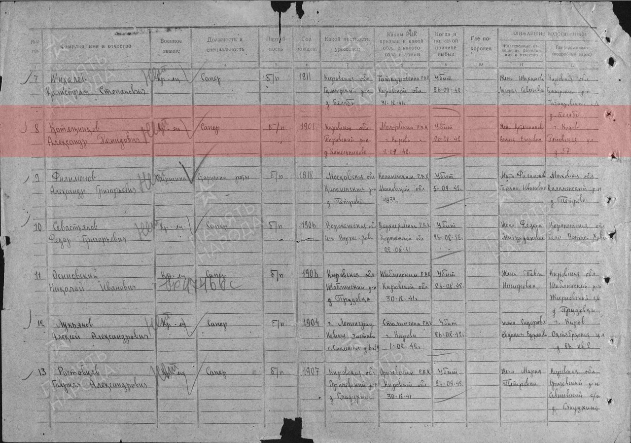 | 4315344009 | КОТЕЛЬНИКОВ Александр Демидович | 1901 г. р., урож. Даровского р-на, красноармеец, сапер 218 осб 131 сд, мобилизован Молотовским ГВК. Погиб 26.08.1942 г. | Кировская область, Киров |