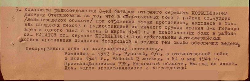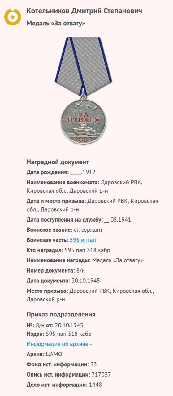 | Участие в Великой Отечественной войне | - | Призван Даровским РВК Кировской области Даровского района 22.06.1941 г. Ст.сержант 595 артиллерийского полка ПВО. | |