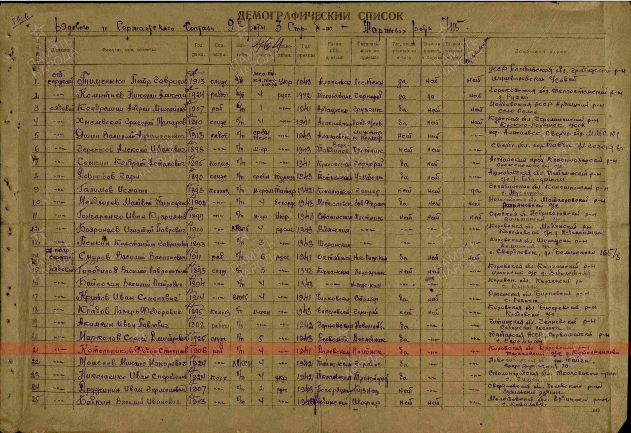 | Родился | 06.07.1906 | деревня Котельниковы (Поломская, Ивенки) (Даровской район, Кировская область) - ныне не существует | Родился в крестьянской семье Котельникова Семена Григорьевича |