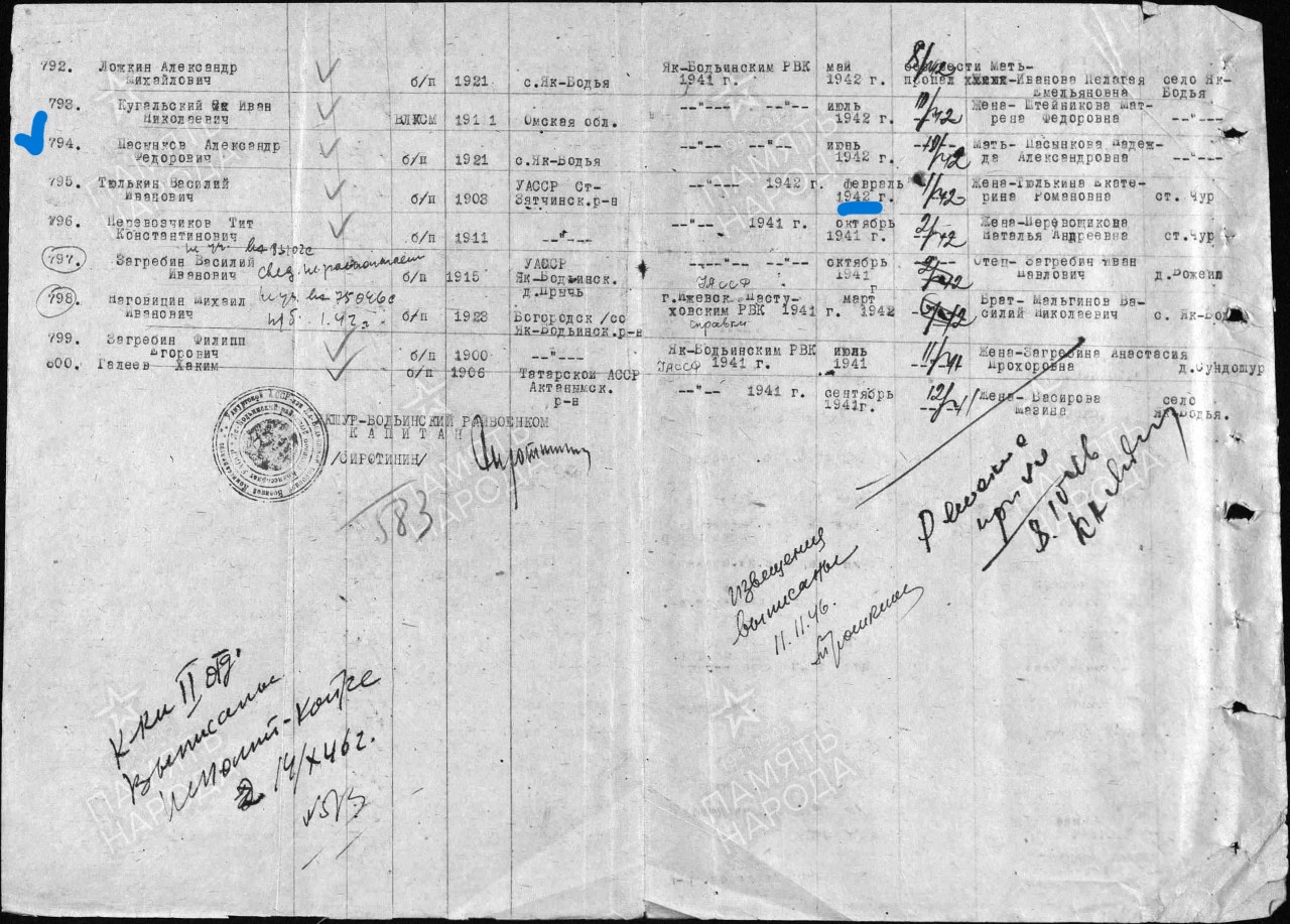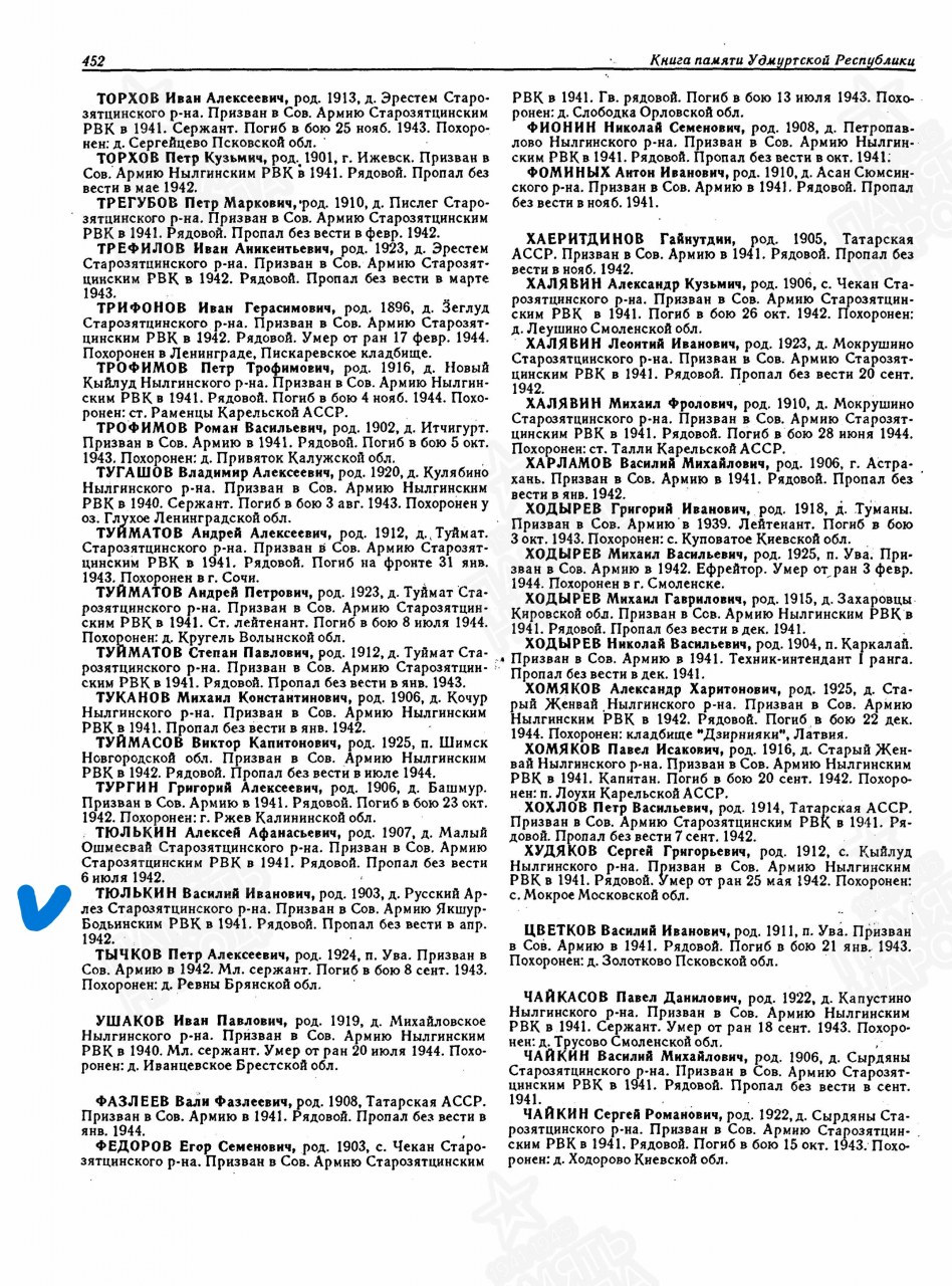 | 1802452016 | ТЮЛЬКИН Василий Иванович | род. 1903, д. Русский Арлез Старозятцинского р-на. Призван в Сов. Армию Якшур-Бодьинским РВК в 1941. Рядовой. Пропал без вести в апр. 1942. | Удмуртская Республика, Увинский район |