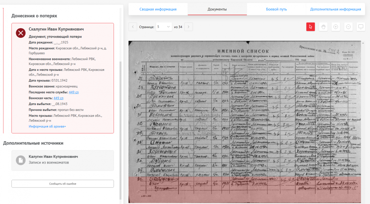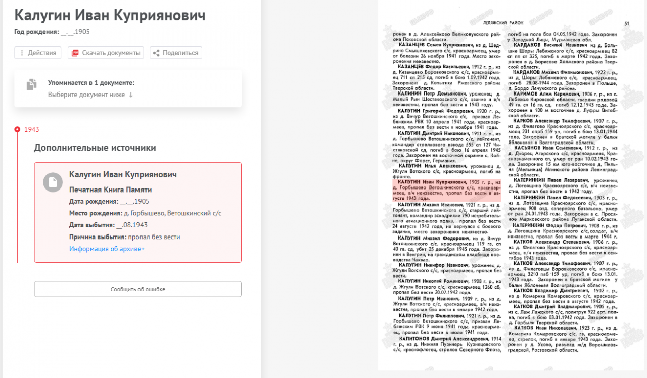 | 4306051007 | КАЛУГИН Иван Куприянович | 1905 г. р., из д. Горбышево Ветошкинского с/с, красноармеец, в/ч неизвестна, пропал без вести в августе 1943 года. | Кировская область, Лебяжский район |