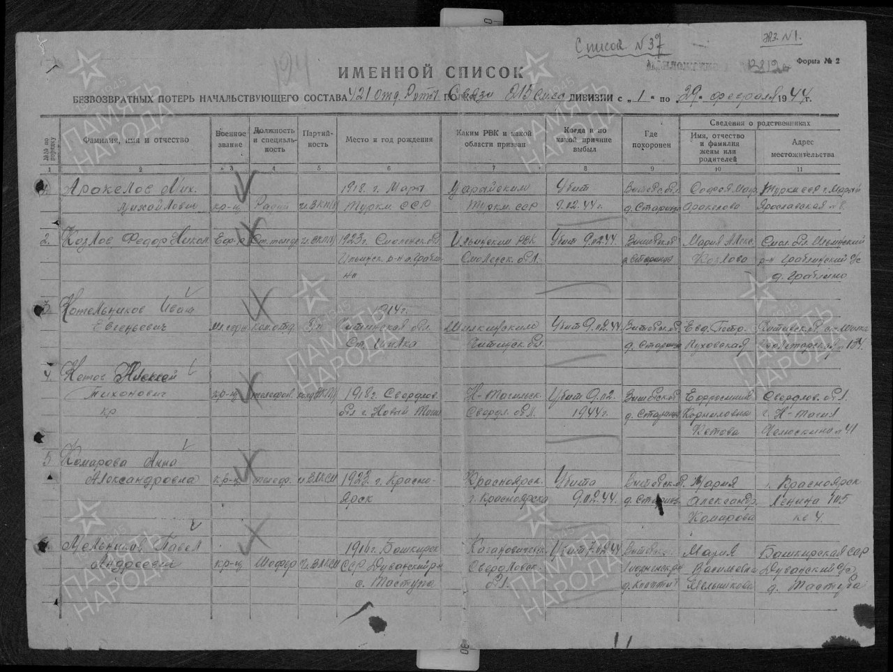 | Погиб | 09.02.1944 | Витебская область, Белорусская ССР |
