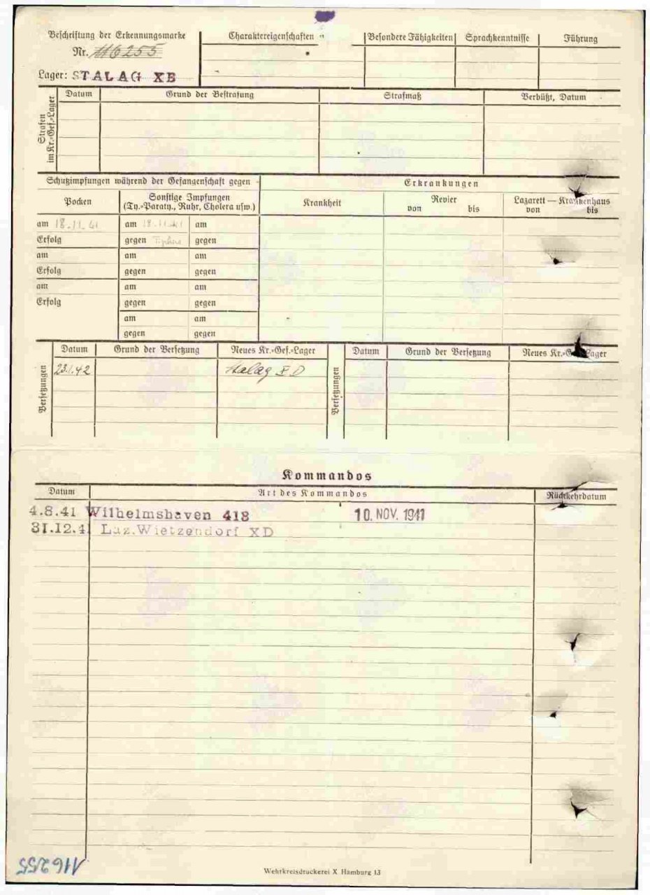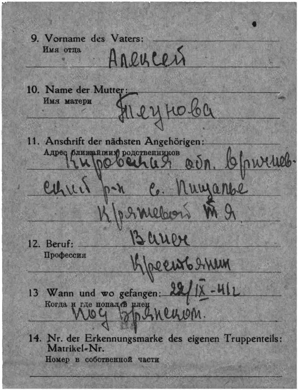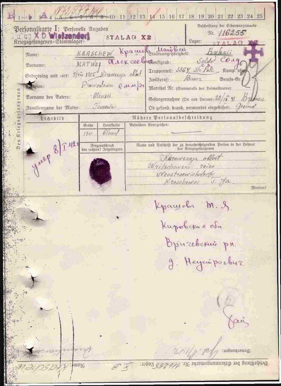 Кряжев Матвей Алексеевич, 1905 г.р., из д. Неустроевы Пищальского с/с Оричевского района. Мобилизован 23.08.1941 г. Оричевским РВК. Красноармеец, стрелок, 14 запасной стрелковй полк (г. Слободской). Последнее письмо 23.09.1941 г. с дороги на фронт (адреса нет). Попал в плен 22.09.1941 г. под Брянском (3364 сп). Лагерь: шталаг X B (поступил в лагерь 14.11.1941 г.). Затем переведен 31.12.1941 г. в лагерь шталаг X D (Витцендорф). Лагерный номер: 116255. Умер 08.01.1942 г. Место захоронения: Витцендорф. Считается пропавшим без вести в декабре 1941 г.