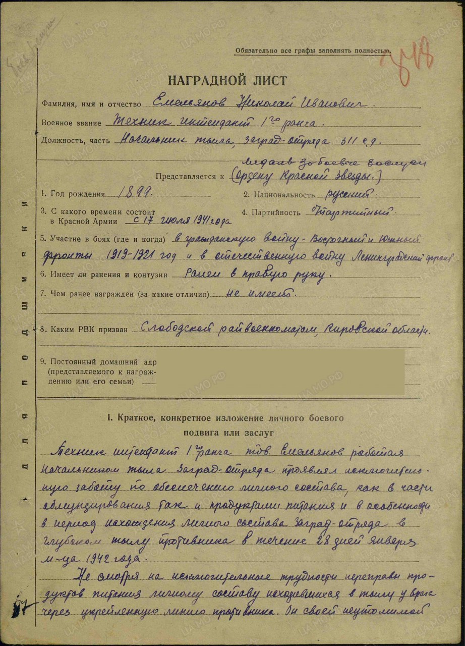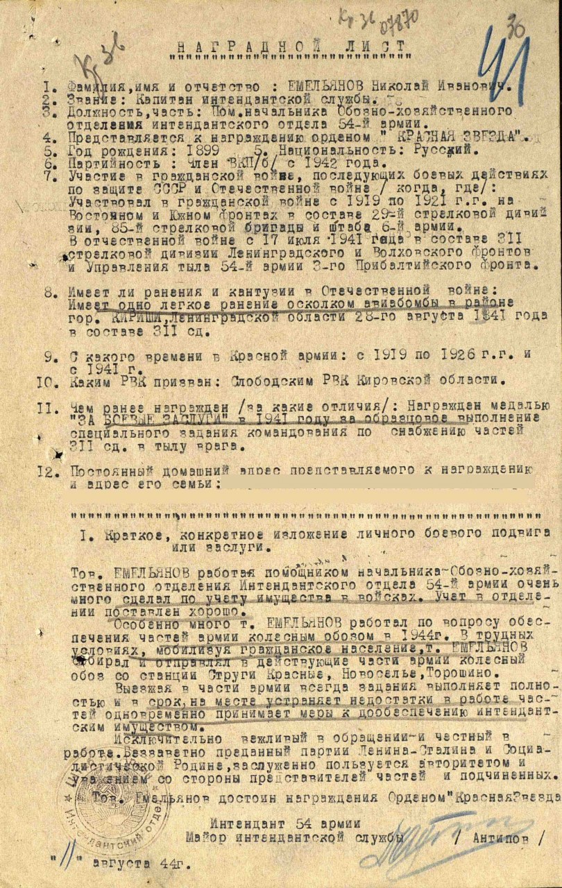 | мобилизация | 17.07.1941 | город Слободской (Слободской район, Кировская область) - существующий н.п. | Капитан инт. службы 311 стр. див. 54 Ар |
