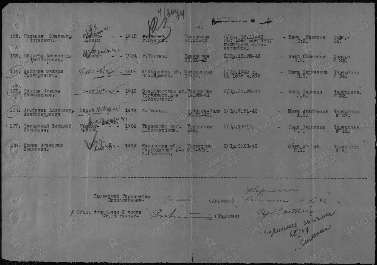 Дата и место призыва 02.02.1942 Тюменский ГВК, Омская обл., г. Тюмень