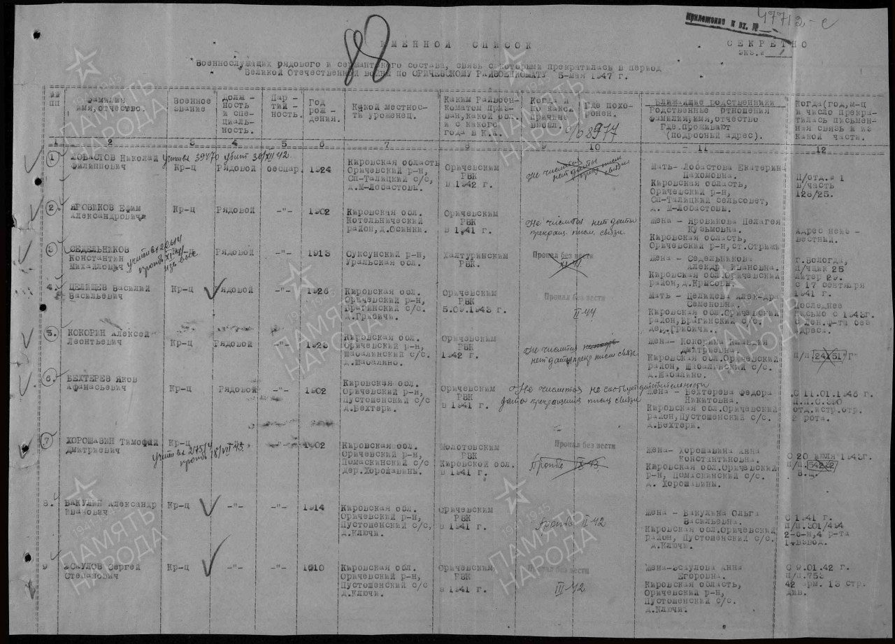 | 4308493011 | ЭСАУЛОВ Сергей Степанович | 1910 г. р., из д. Ключи, Пустошенского с/с, красноармеец, в марте 1942 г. пропал без вести. | Кировская область, Оричевский район |